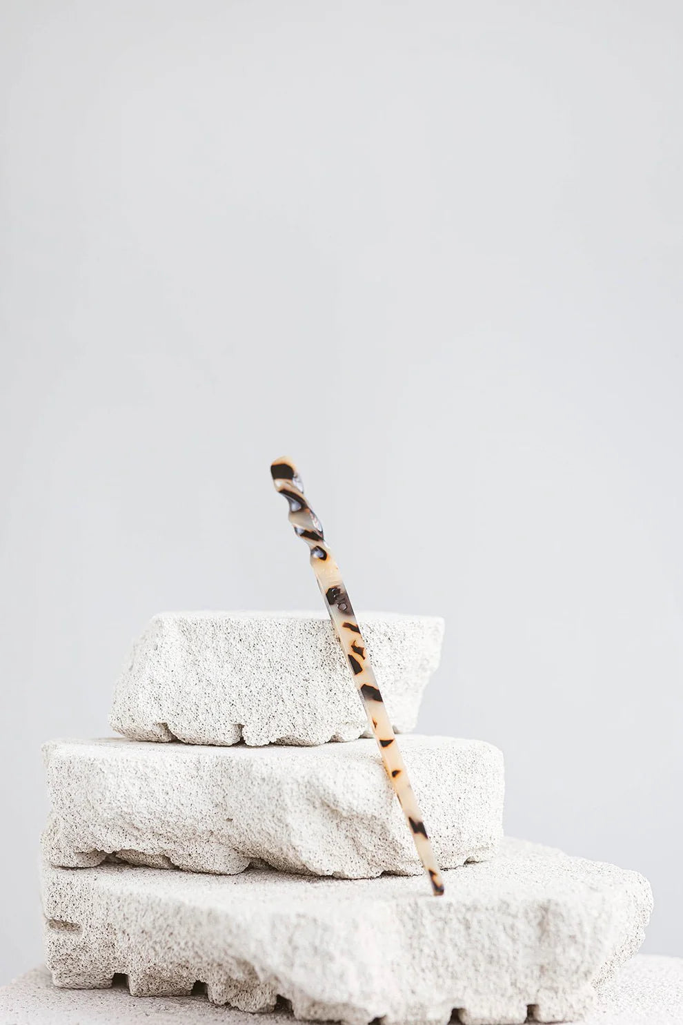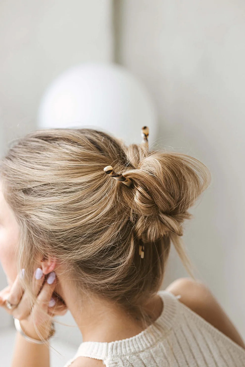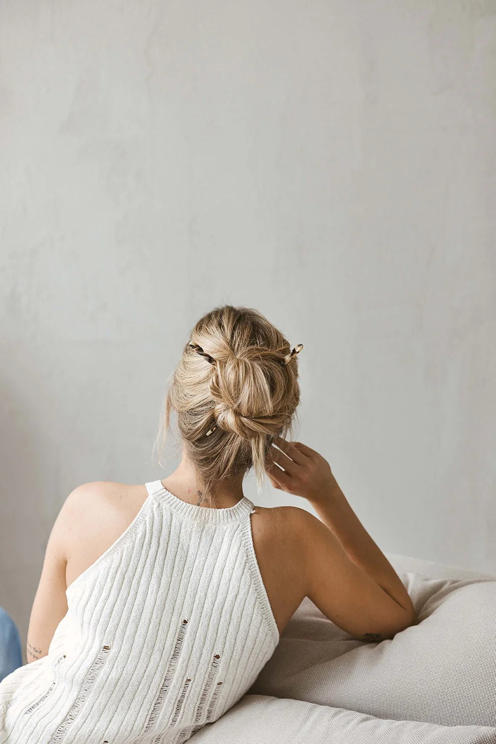 The I-shaped pin is perfect for a quick, simple, effortless hairstyle. Just twist your hair into a bun and insert the pin.