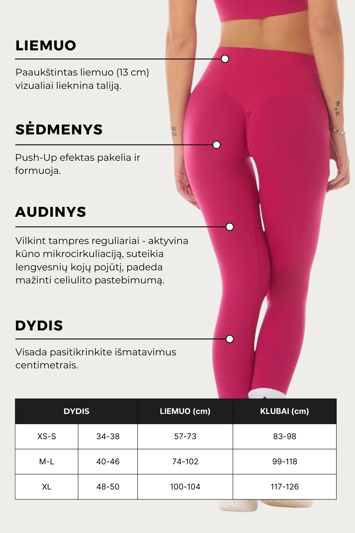 These leggings help fight cellulite and reduce fat and fluid accumulation. Thanks to its microcirculation properties, it improves skin tone, reduces swelling of legs and ankles. The technology of elastic fabric allows to improve the results of physical activity and muscle recovery after it. This is possible due to boactive minerals embedded in the fabric, which absorb body heat and reflect it in the form of long infrared rays. These rays actively work and activate the water molecules in our body tissues. This improves skin tone, microcirculation and blood flow. "Nicole All-Up" is a high-waisted leggings that shapes the waist especially beautifully, and the "All-Up" effect emphasizes the buttocks. Perfect for women of all ages.