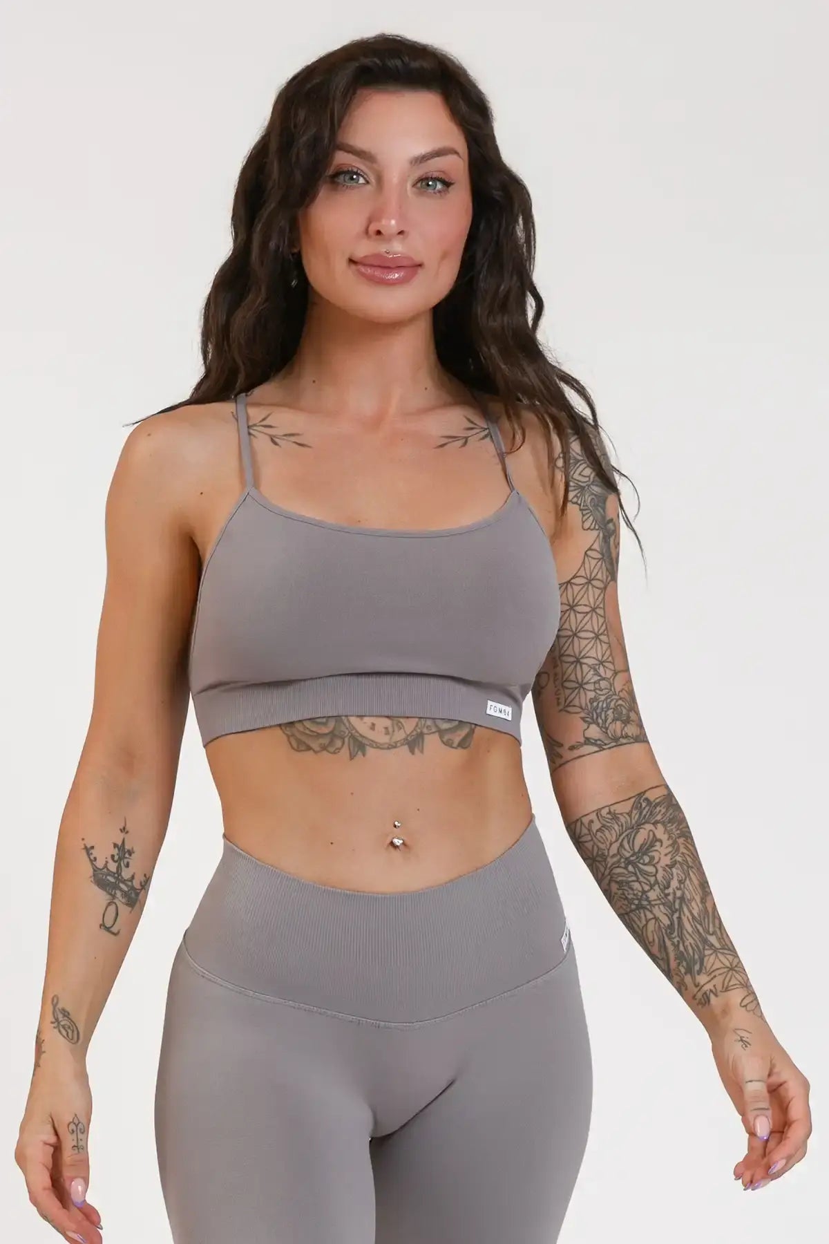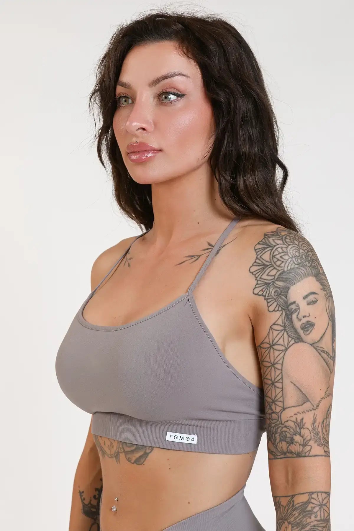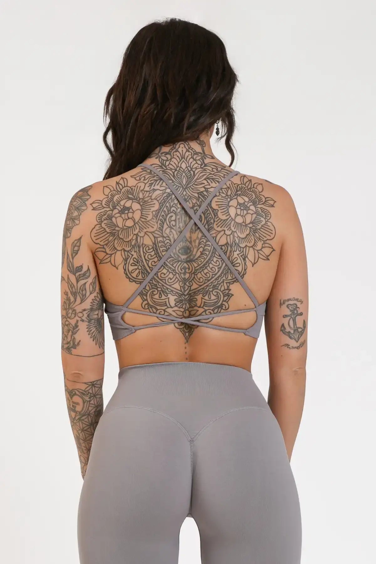 "Angel Satellite" grey sports bra with an open back and crossed straps will add uniqueness to your sports or leisure outfit. Combine the bra with high-waisted shorts or compression leggings and create your favorite outfit!