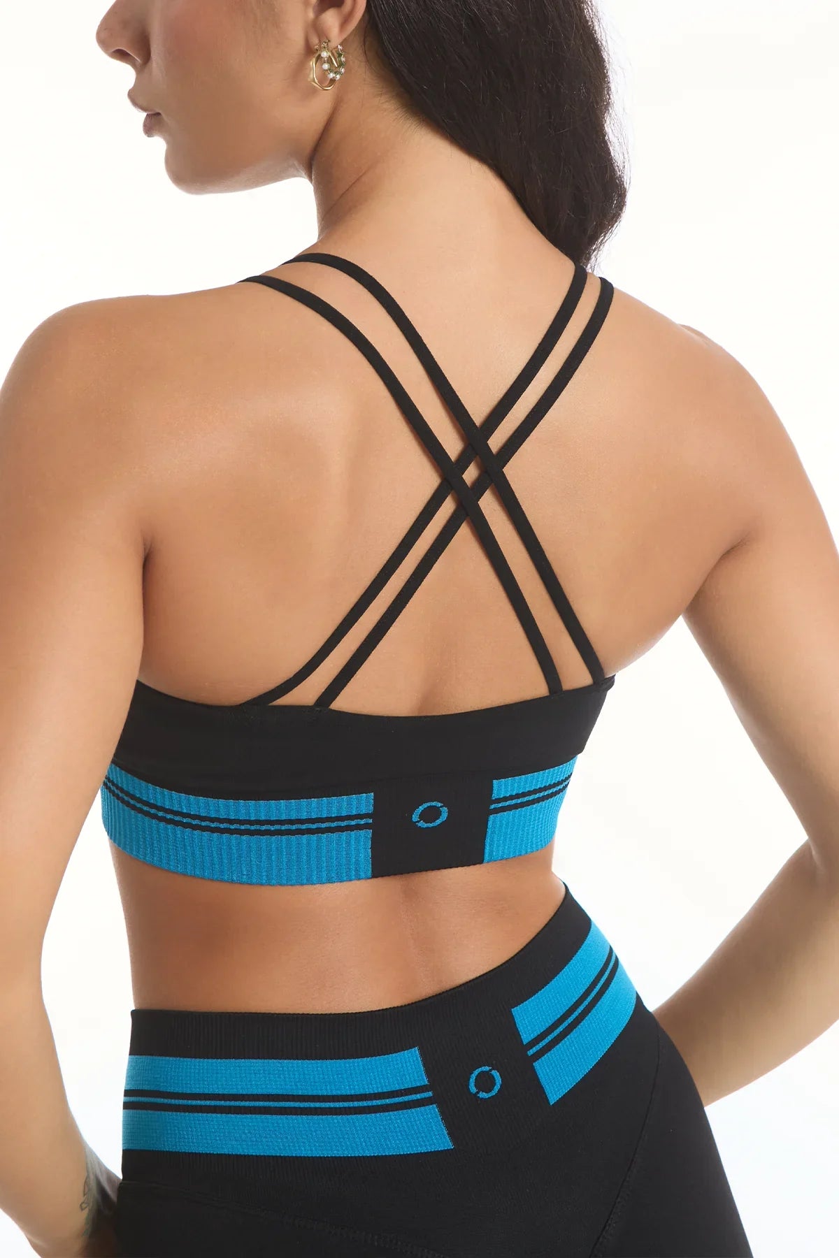 Black sports bra "Ikona" features a unique, stylish design with criss-crossed straps at the back. The bra is seamless, made from elastic, comfortably fitting INNERGY® fabric that provides maximum comfort. This fabric is breathable, ensuring a feeling of freshness and dryness during exercise.